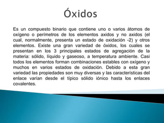 Un óxido es un compuesto binario formado por uno o más átomos de oxígeno y otro elemento. Los óxidos existen en los tres estados de agregación principales y la mayoría de los elementos forman óxidos estables con oxígeno en diferentes estados de oxidación, lo que da como resultado una gran variedad de propiedades.