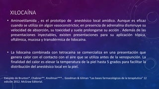 Este documento describe las propiedades y uso de la lidocaína, un anestésico local amídico. Explica que la lidocaína actúa bloqueando los canales de sodio, prolongando el potencial de acción. Se recomienda aplicar una cantidad suficiente para rodear totalmente el nervio y cubrir la mayor extensión posible. La lidocaína se puede diluir hasta una concentración de 0.04% y mantener efecto anestésico. Se proveen dosis recomendadas y se advierten sobre posibles efectos adversos y toxicidad.
