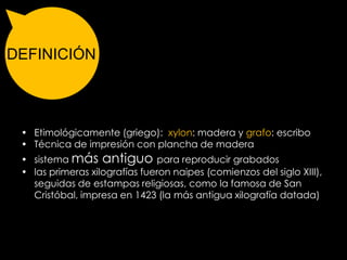 La xilografía es la técnica de impresión más antigua utilizando planchas de madera grabadas. Se originó en China y se perfeccionó en Japón, donde alcanzó su máxima expresión. Consiste en tallar la madera para eliminar las zonas que no se quieren imprimir y dejar las líneas del dibujo, que se entintan para pasar la imagen al papel. Fue muy popular en Japón para imprimir libros y estampas ukiyo-e de la vida cotidiana.