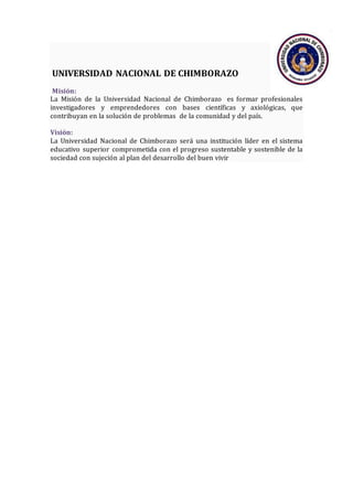 La Facultad de Ciencias de la Educación, Humanas y Tecnologías de la Universidad Nacional de Chimborazo busca convertirse en una facultad de renombre a nivel nacional e internacional vinculada con otras instituciones y enmarcada en los últimos avances científicos y tecnológicos. Su misión es formar maestros de todos los niveles educativos de acuerdo a tendencias pedagógicas contemporáneas para brindar una educación de calidad. La Universidad Nacional de Chimborazo busca formar profesionales