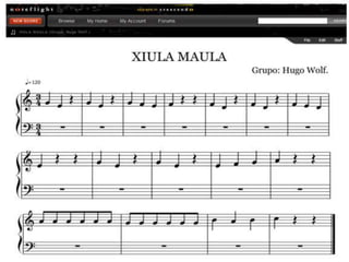 Este documento presenta una canción infantil titulada "Xiula, maula" con instrucciones para su interpretación y objetivos educativos. La canción se compone de cuatro versos y será cantada y acompañada de movimientos corporales por niños de tercer ciclo para fomentar la creatividad y coordinación grupal a través de la música y el arte.