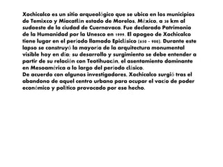 Xochicalco fue un importante centro ceremonial y urbano durante el período Epiclásico en México. Ubicado en el estado de Morelos, fue declarado Patrimonio de la Humanidad por la UNESCO en 1999. La mayor parte de su arquitectura monumental data del 650-900 d.C. y surgió luego del declive de Teotihuacán para ocupar el vacío de poder en la región.