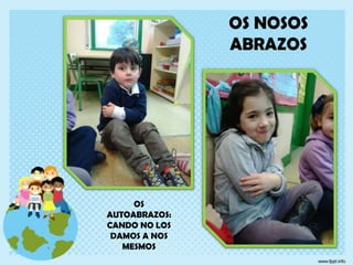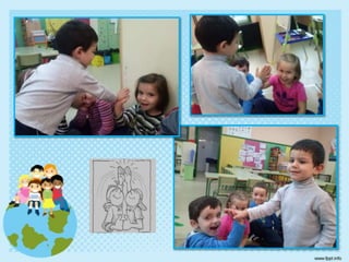 Este documento habla sobre diferentes tipos de abrazos, besos y formas de mostrar afecto entre amigos y familiares. Describe abrazos cálidos y fríos, fuertes y suaves, de frente y de espalda. También menciona besos en la mejilla, de amigos, buenos días y adiós, y de amor. Resalta la importancia de compartir, ayudarse unos a otros y sonreír.