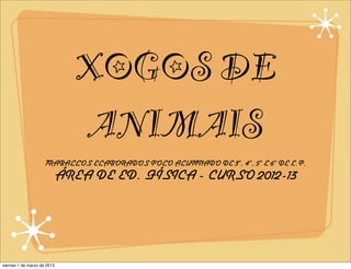 Este documento presenta trabajos elaborados por estudiantes de 3o a 6o grado sobre juegos relacionados con animales en la clase de educación física durante el curso escolar 2012-2013. Incluye ilustraciones y descripciones breves de varios juegos diseñados para simular el movimiento y comportamiento de animales.