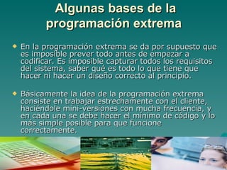 El documento describe los principios y prácticas de la programación extrema (XP). La XP se basa en la simplicidad, comunicación y retroalimentación continua. Promueve trabajar en estrecha colaboración con el cliente para entregar versiones frecuentes con el código mínimo necesario para que funcione.
