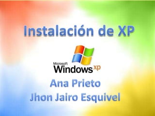 El documento proporciona instrucciones paso a paso para instalar Windows XP en un disco duro, incluyendo confirmar la instalación, formatear y crear una partición, introducir datos de configuración como idioma, nombre de usuario y contraseña, y finalmente completar la instalación.