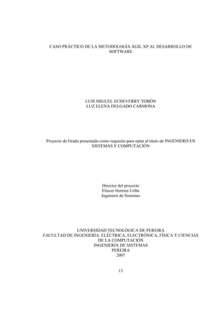 Este documento presenta un caso práctico de la aplicación de la metodología ágil eXtreme Programming (XP) al desarrollo de un software para tenderos. Describe la experiencia de implementar las prácticas de XP como historias de usuario, iteraciones, integraciones frecuentes y pruebas unitarias. Finalmente, analiza ventajas y desventajas encontradas durante el proceso para determinar la conveniencia de usar XP para proyectos similares.