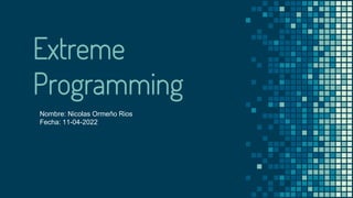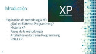 Extreme Programming (XP) es una metodología ágil de desarrollo de software basada en la comunicación, la reutilización de código y la retroalimentación. Utiliza historias de usuario, tareas de ingeniería, pruebas de aceptación y pruebas unitarias como artefactos principales. Los roles incluyen programadores, clientes, entrenadores, rastreadores y probadores.