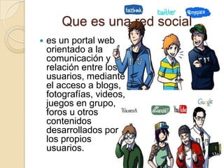 Las redes sociales son portales web orientados a la comunicación y relación entre usuarios mediante contenidos como blogs, fotos, videos y juegos. Su objetivo principal es conectar e interconectar personas permitiendo la interacción entre todos los usuarios. Las redes sociales se usan para mantener contacto con conocidos y entretenimiento aunque también pueden ser adictivas y exponer la privacidad de las personas. Ofrecen tanto ventajas como inconvenientes en el uso personal.