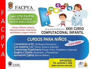 La Facultad de Ciencias Políticas y Administración Pública (FACPYA) anuncia la apertura de inscripciones para varios cursos de computación y manualidades que se llevarán a cabo durante 3 semanas de 8:00 a 12:30 hrs en sus instalaciones, incluyendo cursos introductorios sobre software educativo, números, publicidad y diseño, así como cursos avanzados de animación, diseño gráfico y edición de imagen, además de una actividad opcional de manualidades. Los interesados pueden obtener más información llamando