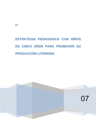 Este documento presenta una propuesta de estrategia pedagógica para promover la producción literaria en niños de cinco años. La estrategia incluye conocer las características de los niños a través de un diario de campo, elaborar una propuesta de creación literaria y aplicarla mediante talleres prácticos evaluando los resultados. El objetivo es motivar el desarrollo creativo de los niños utilizando la literatura infantil.