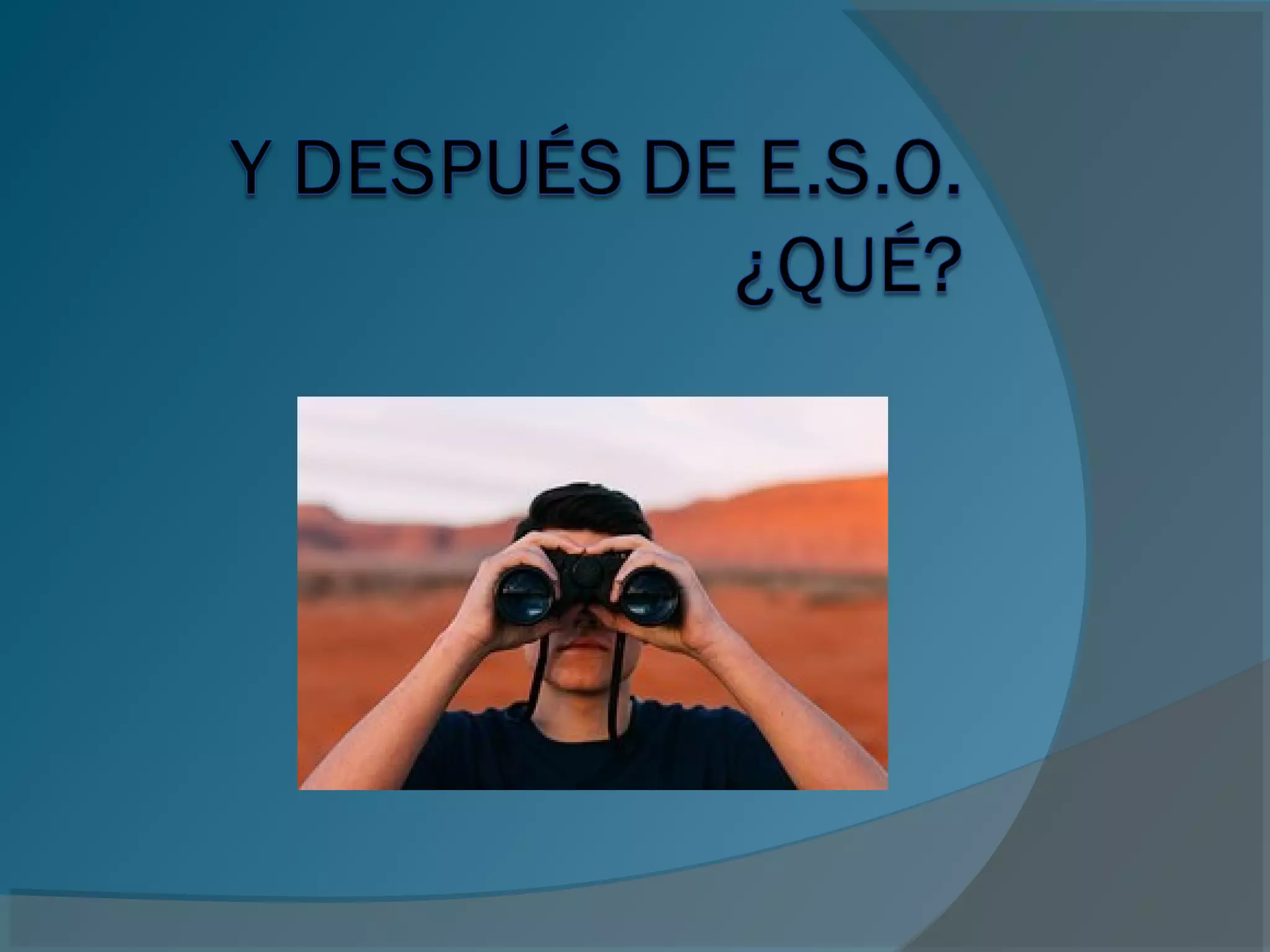Este documento ofrece información sobre las diferentes opciones educativas y formativas disponibles después de completar la Educación Secundaria Obligatoria (ESO), incluyendo Bachillerato, Ciclos Formativos de Grado Medio y Superior, pruebas para acceder a la universidad, y enseñanzas de régimen especial como artes, deportes y música. Se enfatiza la importancia de conocer tus propias capacidades, intereses y motivaciones para tomar la mejor decisión sobre tu futuro académico y laboral.