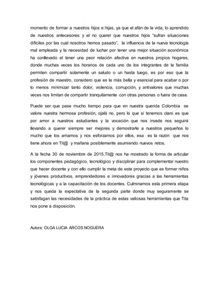 El documento describe la experiencia de un docente participando en el programa TIT@ EDPT, un convenio entre la Universidad del Valle y la Secretaría de Educación de Cali para capacitar a maestros en el uso de TIC en la enseñanza. Inicialmente el docente no fue seleccionado pero logró ingresar tras hablar con una instructora. Desde entonces ha compartido con otros maestros y aprendido sobre la importancia de su labor. El programa le ha mostrado cómo integrar lo pedagógico, tecnológico y disciplinar para complementar su que