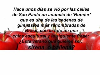 La mujer envió un correo a la cadena de gimnasios Runner criticando su publicidad que comparaba a las mujeres con sirenas o ballenas dependiendo de su apariencia física. Argumentó que las ballenas tienen una vida social y familiar plena, mientras que las sirenas son tristes y solitarias. Concluyó indicando que prefiere ser una ballena y disfrutar de la vida con sus seres queridos en lugar de enfocarse sólo en su apariencia.