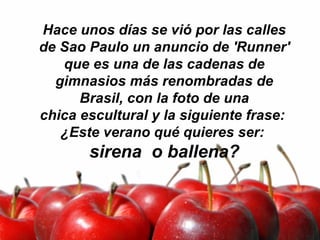 La mujer envió un correo a la cadena de gimnasios Runner criticando su publicidad que comparaba a las mujeres con sirenas o ballenas dependiendo de su apariencia física. Argumentó que las ballenas tienen una vida social y familiar plena, mientras que las sirenas son tristes y solitarias. Concluyó diciendo que prefiere ser una ballena y disfrutar de la vida con sus seres queridos en lugar de enfocarse sólo en su apariencia.