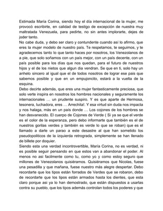 El autor, Rubén Cantafio, se dirige a María Corina Machado instándola a abandonar posturas individualistas y a unirse a un frente unitario en la oposición venezolana para enfrentar al gobierno actual. Señala que la verdadera solución está en el voto y en lograr una mayoría absoluta en las elecciones de la Asamblea Nacional. Cantafio enfatiza que la división y la falta de unidad solo benefician al régimen, y hace un llamado urgente a actuar en conjunto para recuperar el país.