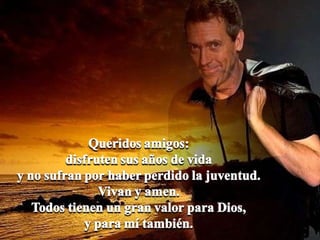 El documento es una reflexión sobre el proceso de envejecimiento y las ventajas de hacerse mayor. El autor expresa que se siente libre de hacer lo que desea sin preocuparse por lo que otros piensen. Aprecia haber vivido lo suficiente para ver sus cabellos volverse grises y disfrutar pequeños placeres como comer postre o bailar música de los 50 y 60.