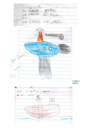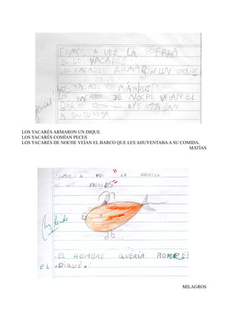 Los yacarés construyeron una presa para atrapar peces, pero por las noches un barco asustaba a los peces y los yacarés no podían comer. Los nombres Matías, Milagros, Camila, Sofía, Joel y Mateo aparecen al final del documento.