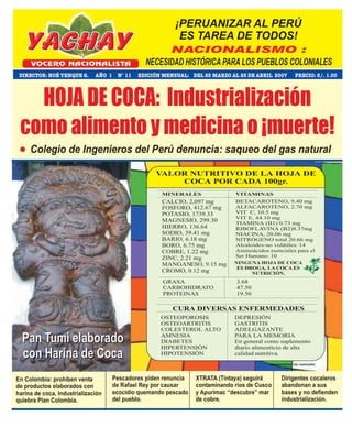 Este documento presenta una discusión sobre la hoja de coca en el Perú. Propone que la industrialización de la hoja de coca es el camino hacia la unidad de las cuencas cocaleras y el desarrollo agrícola nacional. Sin embargo, grupos externos se oponen a esta industrialización para usos alimenticios y medicinales porque quieren control geopolítico de la región y sus recursos. Se argumenta que la despenalización de la hoja de coca no es suficiente y se necesita una nueva generación de líderes cocal