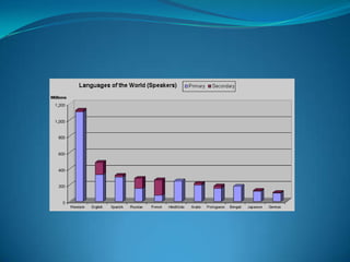 El documento discute brevemente el número de idiomas en el mundo, notando que existen alrededor de 6000 aunque el número exacto es incierto. Luego define qué es un idioma y cómo se clasifican, mencionando que derivan de un número menor de familias lingüísticas. Brevemente describe el español, inglés y chino mandarín, señalando que el español es hablado por 450-500 millones, el inglés es ampliamente estudiado y el mandarín es el idioma más hablado en China.