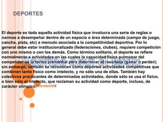 El documento describe la evolución del deporte a través de la historia y su influencia en la sociedad moderna. El deporte se ha vuelto más organizado y regulado desde la antigua Grecia, y la industrialización ha aumentado la participación deportiva. En la actualidad, el deporte profesional es una gran industria y tiene efectos positivos en la educación, economía y salud pública.
