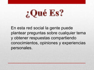 Este documento describe una red social en la que las personas pueden hacer preguntas sobre cualquier tema y recibir respuestas de otros usuarios basadas en sus conocimientos y experiencias personales. Para participar, es necesario crear una cuenta gratuita, lo que permite buscar preguntas ya respondidas sobre diferentes temas o hacer nuevas preguntas y recibir respuestas de otros miembros registrados. La red social se presenta como una herramienta útil para la educación y el conocimiento de sus usuarios.