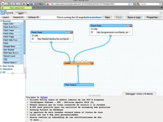 El documento aborda el uso de Y! Pipes, una herramienta de programación visual que permite a los usuarios crear mash-ups de datos a partir de diversas fuentes en la web 2.0. Se discuten los flujos de datos, módulos y operaciones que se pueden implementar, así como ejemplos prácticos sobre cómo construir pipes para obtener información específica. También se mencionan los beneficios de manipular y reconfigurar datos generados por los usuarios y aplicaciones.