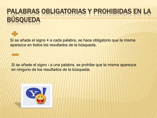 El documento describe las funciones y sintaxis de búsqueda disponibles en Yahoo!, incluyendo palabras obligatorias y prohibidas, restricciones a secciones, correspondencia exacta de frases, uso de comodines, y búsquedas avanzadas. También explica que Yahoo es pionero en buscadores temáticos, ofreciendo una estructura de directorios y opciones de búsqueda a través de la navegación por directorios o el uso de un buscador.