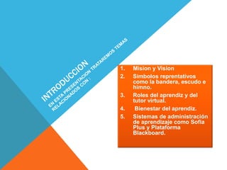 El documento describe las funciones y objetivos del Servicio Nacional de Aprendizaje (SENA) de Colombia. El SENA se encarga de ofrecer formación profesional integral a los trabajadores colombianos para contribuir al desarrollo del país. También describe los símbolos representativos del SENA como su logotipo, escudo, bandera e himno. Explica los roles del aprendiz y tutor virtual, así como los sistemas de administración de aprendizaje utilizados por el SENA.