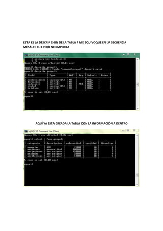 La primera oración describe la creación de una tabla llamada GRUPO1 con los campos IDNO y FECHA. La segunda oración indica que se proporciona una descripción de la tabla. La tercera oración menciona que se creó la tabla con información dentro.