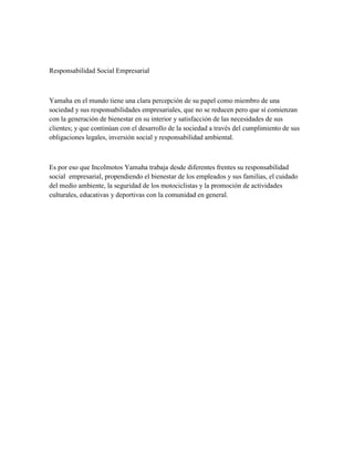1) La misión de Incolmotos Yamaha es crear KANDO, que expresa sentimientos de profunda emoción y satisfacción al encontrar algo excepcional. 2) Su visión es ser una de las empresas más rentables y de mayor crecimiento en Colombia y dentro del Grupo Yamaha, entregando siempre valor a sus clientes. 3) Los valores principales incluyen la emoción, la innovación y el desafío.