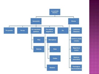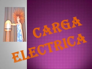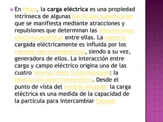 La carga eléctrica es una propiedad fundamental de partículas subatómicas que se manifiesta a través de atracciones y repulsiones electromagnéticas. La carga es discreta y puede ser positiva como en protones o negativa como en electrones. La carga total se conserva en cualquier proceso físico aislado. Existen diferentes tipos de electrización como por contacto, fricción o inducción que producen la ganancia o pérdida de electrones en un cuerpo.
