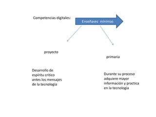 El documento describe las competencias digitales mínimas que los estudiantes de primaria deben desarrollar, incluyendo el espíritu crítico ante los mensajes de la tecnología, aprender a aprender, sentido de iniciativa, manejo de la información de forma cognitiva, técnica y ética, alfabetización digital y visual, y capacidad de buscar y procesar información.