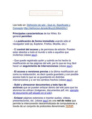 Un wiki es una página web cuyo contenido puede ser editado por múltiples usuarios a través de cualquier navegador. Los wikis se desarrollan a través de la colaboración entre usuarios y permiten agregar, modificar o eliminar información de forma rápida. El término "wiki" proviene del hawaiano "wiki wiki" que significa rápido.