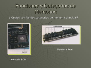 Las dos categorías de memoria principal son la memoria ROM y la memoria RAM. La memoria ROM es permanente y contiene instrucciones para iniciar la operación del computador, mientras que la memoria RAM es volátil y almacena los programas y datos que se están procesando actualmente. La memoria RAM se utiliza para almacenar información cerca de la CPU y hay varios tipos como SDRAM, DDR SDRAM y RDRAM.