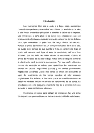 Este documento explica la diferencia entre bonos y acciones. Los bonos son certificados de deuda que comprometen al emisor a pagar una suma determinada más intereses en una fecha de vencimiento fija. Las acciones representan la propiedad que tiene un accionista sobre una empresa y otorgan derechos como recibir dividendos y ejercer voto. Mientras que los bonos tienen un valor y fecha de vencimiento fijos con menor riesgo, el precio de las acciones es más volátil y depende del rendimiento de la empresa.