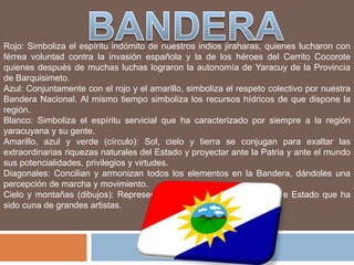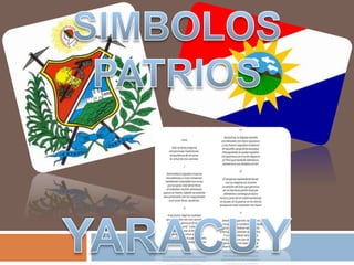 El documento describe los símbolos de la bandera y el escudo de armas del estado Yaracuy en Venezuela. La bandera incluye el rojo que simboliza la lucha de los indígenas, el azul que representa los recursos hídricos, y el blanco que representa el espíritu servicial de la gente de la región. El escudo de armas fue diseñado por el Dr. Pablo Emilio Ávila e incluye símbolos de la agricultura, la caña de azúcar y el cacao, así como una fortaleza que representa el Castillo