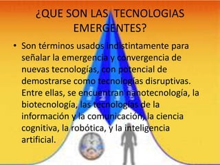 Este documento presenta varias tecnologías emergentes, incluyendo drones para agricultura, smartphones con privacidad mejorada, chips neuromórficos, edición genómica, robots ágiles, realidad virtual, colaboración móvil, microimpresión 3D, mapas cerebrales detallados, y energías renovables inteligentes.