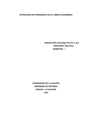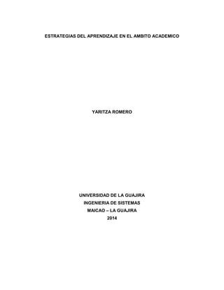 Este documento resume las estrategias de aprendizaje en el ámbito académico. Explica que las estrategias de aprendizaje tienen como objetivo activar el aprendizaje de los estudiantes. Luego clasifica las estrategias de aprendizaje en cinco tipos: estrategias de ensayo, estrategias de elaboración, estrategias de organización, estrategias de control de comprensión y estrategias de apoyo. Cada tipo se define y se dan ejemplos de estrategias específicas.