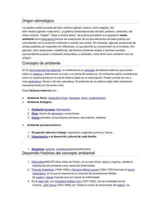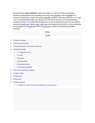 El documento define el medio ambiente como todo lo que rodea a los seres vivos, incluyendo factores naturales, sociales y culturales. El medio ambiente comprende organismos vivos, clima, relieve, valores culturales y su interacción, e influye en la vida humana y futuras generaciones. El 5 de junio se celebra el Día Mundial del Medio Ambiente para crear conciencia sobre la protección del medio ambiente.