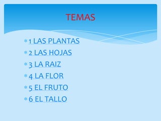 Este documento presenta las partes principales de las plantas, incluyendo las hojas, la raíz, la flor, el fruto y el tallo. Explica que las plantas son organismos autótrofos que fabrican su propia comida utilizando la energía del sol, mientras que los animales son heterótrofos y dependen de otras fuentes para alimentarse. También describe las funciones y características clave de cada parte de la planta.