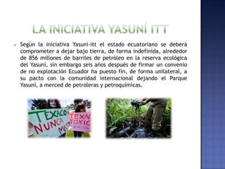 El documento resume la Iniciativa Yasuní-ITT del gobierno ecuatoriano entre 2007 y 2013, la cual proponía dejar 856 millones de barriles de petróleo sin explotar en la reserva Yasuní a cambio de una compensación anual de $350 millones por parte de la comunidad internacional. Sin embargo, seis años después Ecuador puso fin unilateralmente al acuerdo, poniendo en riesgo el parque Yasuní y sus pueblos indígenas aislados.