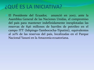 La Iniciativa Yasuní-ITT propone mantener sin explotar las reservas de petróleo en el campo ITT del Parque Nacional Yasuní en Ecuador para proteger la biodiversidad y los pueblos indígenas no contactados. Ecuador busca fondos internacionales para compensar los ingresos no obtenidos del petróleo e invertir en energías renovables. El Parque Yasuní es extremadamente biodiverso y alberga especies únicas así como pueblos indígenas aislados que se verían afectados por la extracción de pet