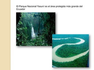 El documento describe el Parque Nacional Yasuní, el área protegida más grande de Ecuador. Ubicado en la Amazonía ecuatoriana, el parque alberga una gran biodiversidad con cientos de especies de plantas y animales. Dentro del parque viven tres grupos indígenas: los Huaoranis, Kichwa y Shuar. El gobierno ecuatoriano propone no explotar el petróleo en la zona norte del parque y pide a otros países pagar por mantener la zona libre de explotación petrolera para proteger el med