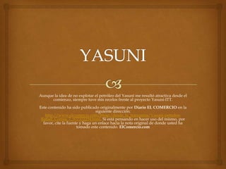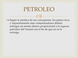 El documento discute las razones por las cuales el autor siempre tuvo recelos sobre el proyecto Yasuní-ITT. Según el autor, aunque la idea de no explotar el petróleo del Yasuní parecía atractiva inicialmente, el proyecto se basaba en la falsa premisa de que los países ricos pagarían a cambio de no extraer el petróleo, y que el petróleo traería progreso, aunque históricamente no ha resuelto la pobreza. El autor argumenta que el proyecto sonaba bonito