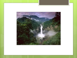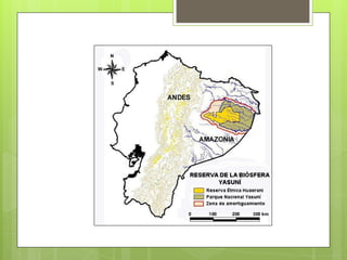 El documento describe el Parque Nacional Yasuní, el área protegida más grande de Ecuador y hogar de una gran diversidad de especies. En 1979 se declaró el Yasuní como parque nacional para preservar su riqueza natural. En 1989 pasó a formar parte de la Reserva Mundial de Biosfera de la UNESCO. La Iniciativa Yasuní-ITT busca evitar la extracción de petróleo en la zona ITT del parque para proteger este ecosistema biodiverso, y pide fondos internacionales para proyectos de energía