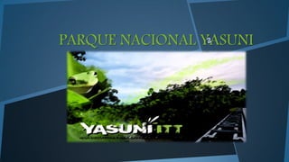 Este documento describe la ubicación y características del Parque Nacional Yasuní. El Parque está localizado en la Amazonía ecuatoriana y comprende las cuencas de varios ríos como el Napo, Yasuní y Tiputini. La geomorfología de la zona consiste en pequeñas colinas formadas por los ríos a lo largo de milenios. Se puede acceder al Parque vía terrestre desde Quito o Coca, o vía fluvial navegando por los ríos Napo, Yasuní y Tiputini desde