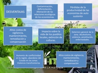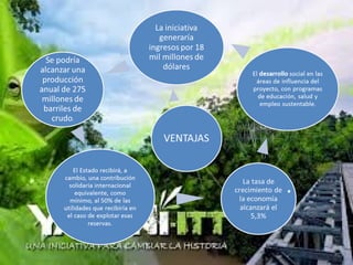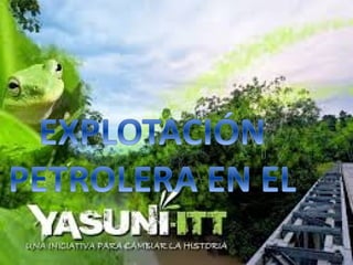 El documento describe el Parque Nacional Yasuní, un área protegida en Ecuador que contiene gran biodiversidad y reservas de petróleo. Recientemente, el gobierno ecuatoriano decidió permitir la extracción de petróleo en el área, poniendo fin a una iniciativa para conservar voluntariamente los recursos a cambio de contribuciones internacionales. Se detallan los posibles impactos ambientales, económicos, sociales y políticos de la actividad petrolera en la región.