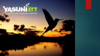 El documento describe la biodiversidad y la importancia ecológica del Parque Nacional Yasuní en Ecuador. Yasuní alberga una gran diversidad de especies de plantas, animales e insectos y es el hogar de pueblos indígenas. A pesar de su valor ecológico, el parque contiene reservas petrolíferas que amenazan la biodiversidad si se explotan. La iniciativa Yasuní busca proteger el parque manteniendo el petróleo bajo tierra a cambio de compensaciones internacionales.