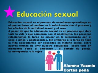 La educación sexual es un proceso de aprendizaje a lo largo de toda la vida sobre el sexo y la actividad sexual. Aunque se asocia principalmente con la educación de niños y adolescentes, los adultos también necesitan educación sexual en diferentes etapas de la vida como el embarazo, cambios de pareja, menopausia y vejez. La sexualidad es un aspecto humano que se expresa a lo largo de toda la vida, aunque la adolescencia y juventud son etapas clave para tomar decisiones al respecto.